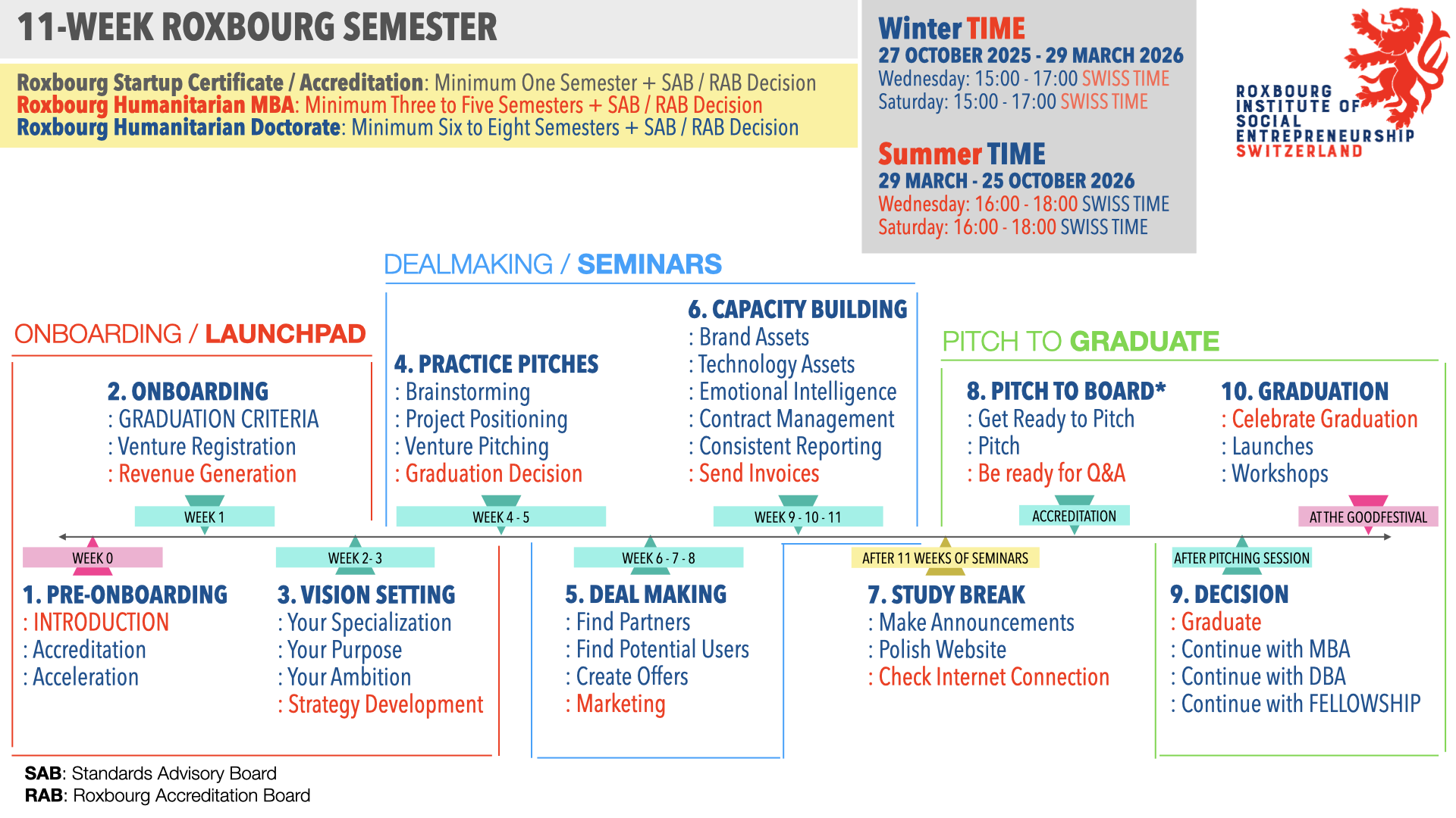 The next 30 to 45 weeks are focused on structuring deals that can provide you the resources you need to build your capability and the capacity after your venture is registered with the local authorities and your website / social media presence is established. The Roxbourg Accreditation Board (RAB) decides who graduates.