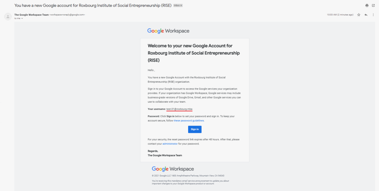 2. The title of the email will be - You have a new Google account for Roxbourg Institute of Social Entrepreneurship (RISE).