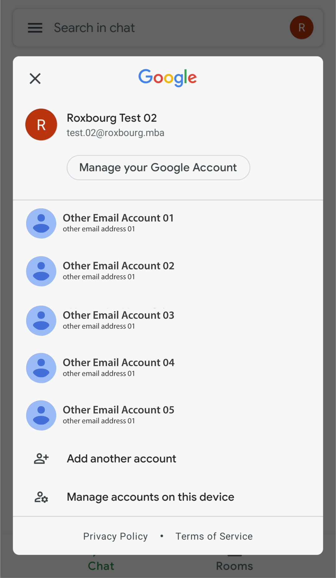 1. Once you have downloaded the Google Chat app, verify you are logged in with your Roxbourg email address by clicking on the icon on the top right corner.